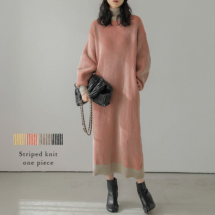 ワンピース ニットワンピ ロング リブ ボリューム袖 ワンピース ニットワンピ ロング リブ ボリューム袖 ストライプ柄 タートルネック 大人可愛い 体系カバー 長袖 レディース おすすめ オシャレ 2025秋新作 【lswp210-591】【即納:1-5営業日】【送料無料】宅込