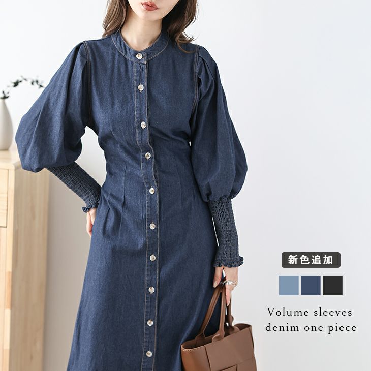 デニムワンピース ボリュームスリーブ シャーリング 7分袖 【春夏半額SALE対象】 デニムワンピース ウエストマーク ボリュームスリーブ シャーリング バンドカラー 7分袖 レディース 2025春 【lswp301-586】【即納:1-5営業日】【送料無料】60込