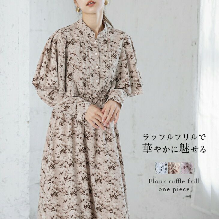 フラワーラッフル フリル ワンピース 花柄 長袖 半袖 ミモレ丈 フェミニン レディース フラワーラッフル フリル ワンピース 花柄 長袖 半袖 ミモレ丈 フェミニン レディース おしゃれ ウエストマーク 長袖【lswp302-50a】【即納:1-5営業日】【送料無料】ユ込3