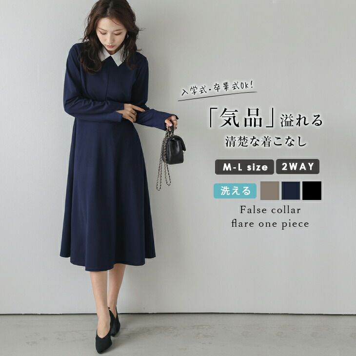 2Way 付け襟 フレアシルエット ワンピース 長袖 【秋半額SALE対象】 2Way 付け襟 フレアシルエット ワンピース 長袖 ウエスト切替 キレイめ 上品 大人かわいい ラウンドネック スリット レディース おすすめ おしゃれ メール便 2025春夏新作【lswpaw24-647】【即納:1-5営業日】【送料無料】メ込2