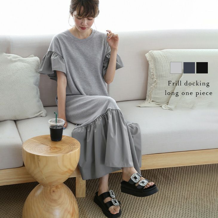 フリル ドッキング ロング丈 ワンピース ギャザー フリル ドッキング ロング丈 ワンピース ギャザー スタイルアップ 体型カバー 半袖 レディース おすすめ おしゃれ フリーサイズ 2025春夏新作 【lswpss24-541】【即納:1-5営業日】【送料無料】メ込2