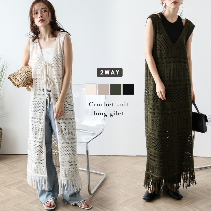 ジレ ロング サマーベスト ワンピース風 2WAY 【春夏半額SALE対象】 ジレ ロング サマーベスト ワンピース風 2WAY かぎ編み リボン フリンジ Vネック レイヤード 大人カジュアル キレイめ レディース おすすめ おしゃれ フリーサイズ 2025春夏新作【lswpss24-550】【即納:1-5営業日】【送料無料】60込