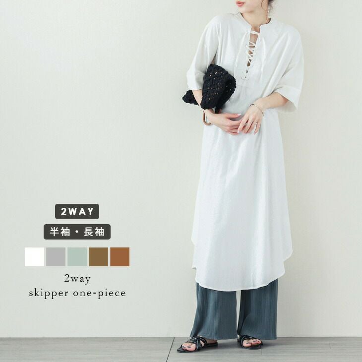 2Way スキッパーワンピース レディース ワンピース 五分袖 長袖 レースアップ ロング丈 ワンピ コットン ミディアム丈 無地 ゆったり おしゃれ 可愛い ホワイト メール便 2025秋新作 フリー 【lgww-at4547】【即納:1-5営業日】【送料無料】メ込2