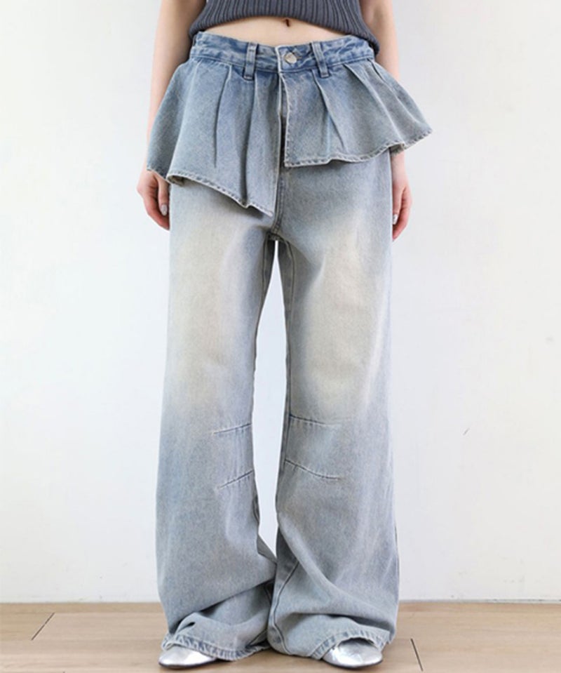 レイヤード風 デニム パンツ ボトムス フリル [AMELY by La-gemme]レイヤード風 デニム パンツ ボトムス フリル アシンメトリー カジュアル ガーリー きれいめ 春夏 おすすめ レディース オシャレ トレンド 人気 プチプラ 韓国ファッション 【atp26-1565】【予約販売:15-20日】【送料無料】宅込