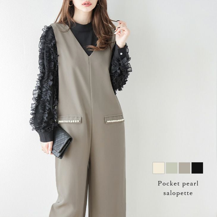 Vネックサロペット パールポケット Iライン ワイド [AMELY by La-gemme]Vネックサロペット パールポケット Iライン ストレート ワイド キレイめ 美シルエット 体型カバー レディース おすすめ おしゃれ メール便 2025春夏新作【ass24-se113】【即納:1-5営業日】【送料無料】メ込2