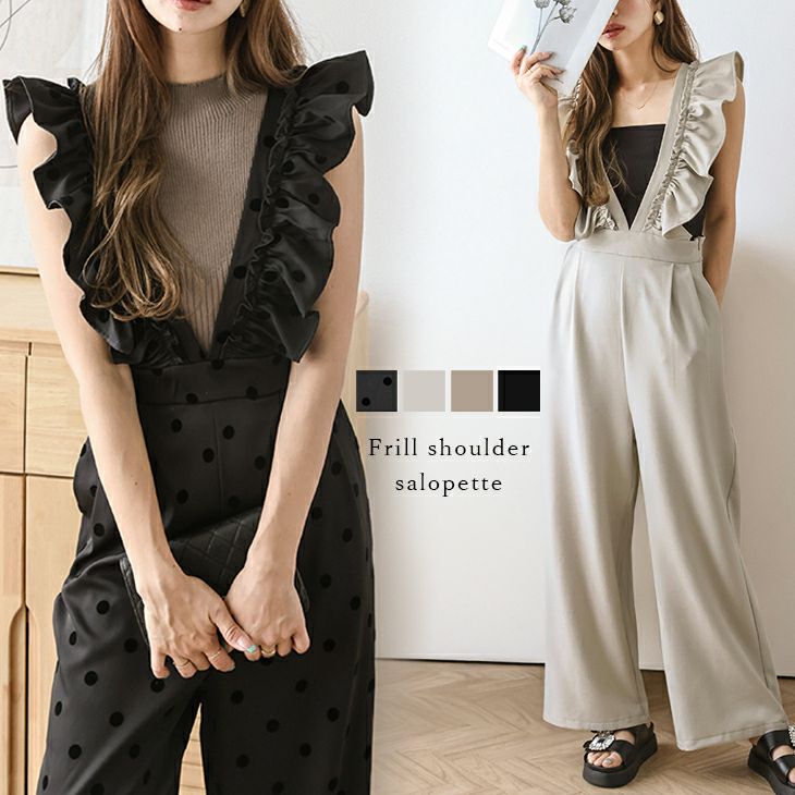 オールインワン サロペット フリル ハイウエスト 【春夏半額SALE対象】 オールインワン サロペット フリル ハイウエスト ドット 可愛い 大人ガーリー 脚長効果 レディース トレンド メール便 2025春夏新作【lss24-sr142】【即納:1-5営業日】【送料無料】メ込3