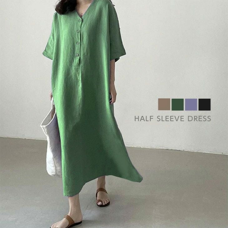 半端袖 ワンピース Vネック ヘンリーネック [AMELY by La-gemme]半端袖 ワンピース Vネック ヘンリーネック ゆったり ロング丈 半袖 カジュアル レディース 春夏 韓国ファッション 【atp205-324】【即納:1-5営業日】【送料無料】メ込2