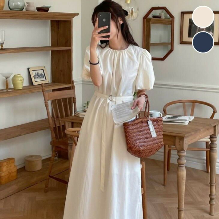 パフスリーブ ロングワンピース ウエストベルト [AMELY by La-gemme]パフスリーブ ロングワンピース ウエストベルト Aライン キレイめ フェミニン 5分袖 デート おすすめ おしゃれ レディース トレンド 人気 プチプラ 韓国ファッション 2025春夏新作【33450-d】【予約販売:15-20日】【送料無料】メ込2