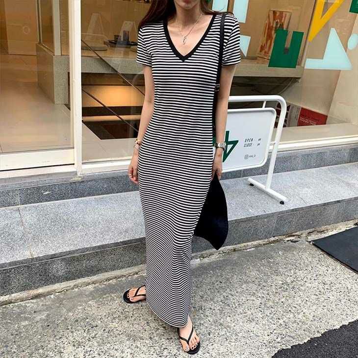 [AMELY by La-gemme]ボーダーワンピース Vネック 半袖 ロング マキシ トレンド 可愛い 上品 可愛い 大人カジュアル シンプル 抜け感 おしゃれ レディース 春 夏 プチプラ 韓国ファッション 【awp304-033】【即納:1-5営業日】【送料無料】ユ込3