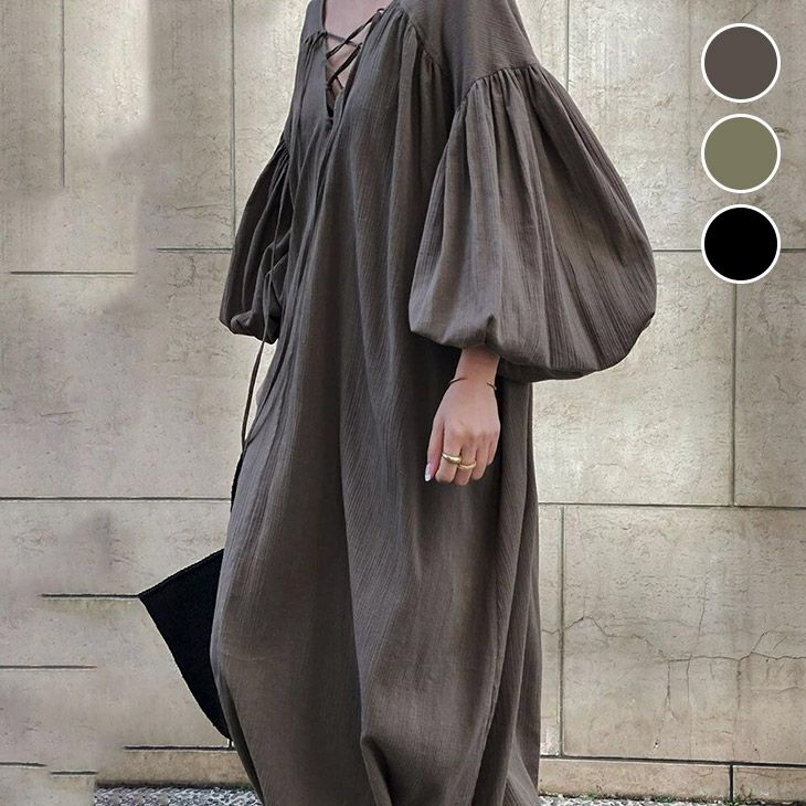 レースアップ Vネック バルーンスリーブ ワンピース ロング [AMELY by La-gemme]レースアップ Vネック バルーンスリーブ ワンピース ロング ワンピ ゆったり バックオープン デート おすすめ レディース トレンド 人気 プチプラ 韓国ファッション 2025春夏新作 【awp308-091】【予約販売:15-20日】【送料無料】メ込4