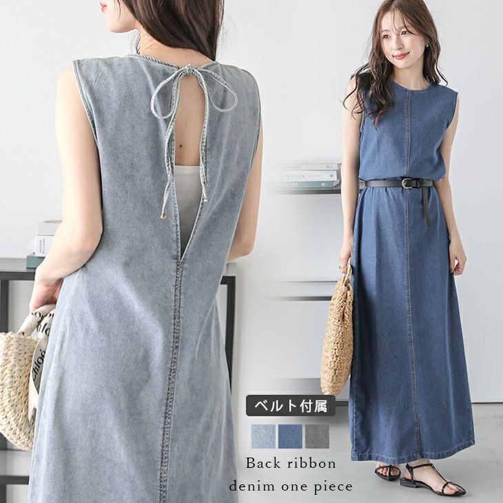 デニムワンピース コットンデニム Vスリットスリット [AMELY by La-gemme]デニムワンピース コットンデニム バックコンシャス Vスリット バックスリット リボン ノースリーブ ベルト付き Iラインシルエット レディース おすすめ おしゃれ メール便 2025春夏新作【awpss25-1145】【即納:1-5営業日】【送料無料】メ込2