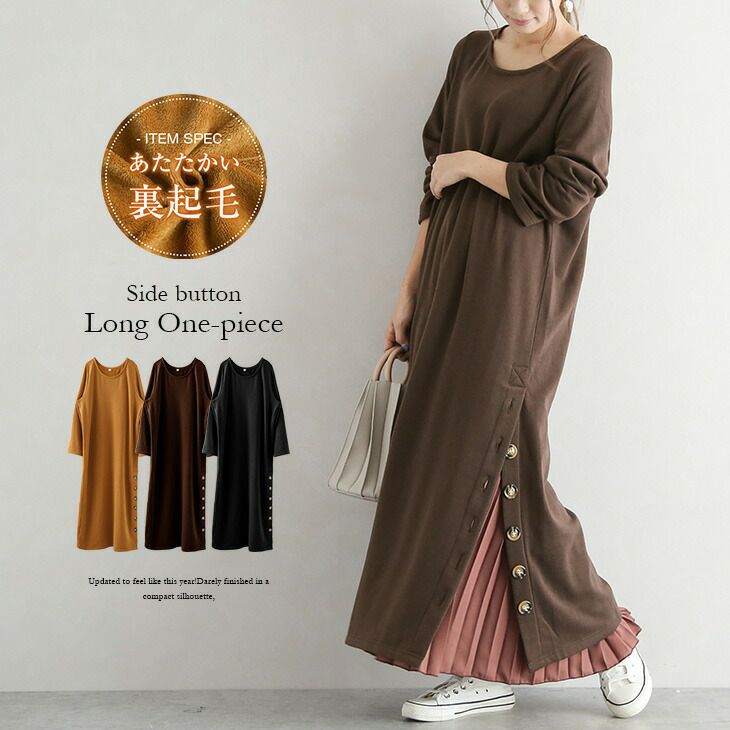 ワンピース 裏起毛 マキシ ロング 長袖 ワンピース 裏起毛 マキシ ロング 長袖 レディース サイドスリット あったか ゆったり ボタン 無地 おしゃれ 大人 大人カジュアル ブラック 2025秋新作 フリー 【lgww-at2597】【即納:1-5営業日】【送料無料】宅込