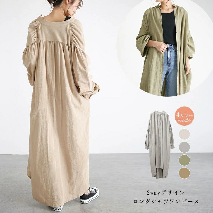 2way シャツワンピース ロング ロングシャツ ロングワンピース 2way綿麻シャツワンピース ロング ロングシャツ ロングワンピース ワンピース オーバーサイズ バックギャザー 大人 ナチュラル レディース ロング丈 2025秋新作 フリー 【lgww-at4240】【即納:1-5営業日】メ込2