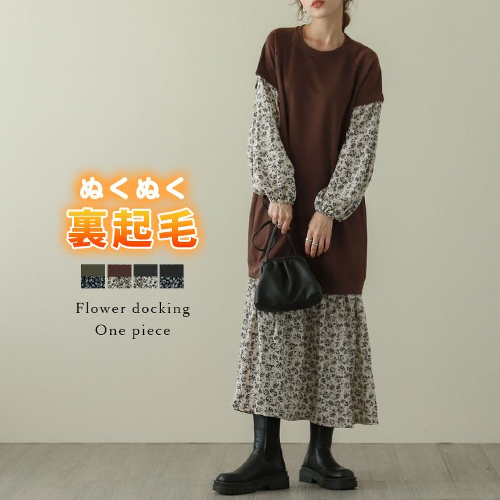 ドッキングワンピース レディース フラワー柄 重ね着風 裏起毛 ドッキングワンピース レディース フラワー柄 重ね着風 ロング丈 クルーネック あったか 大人カジュアル おしゃれ 可愛い ブラック 2025秋新作 フリー 【lgww-at4461】【即納:1-5営業日】【送料無料】ヤ込