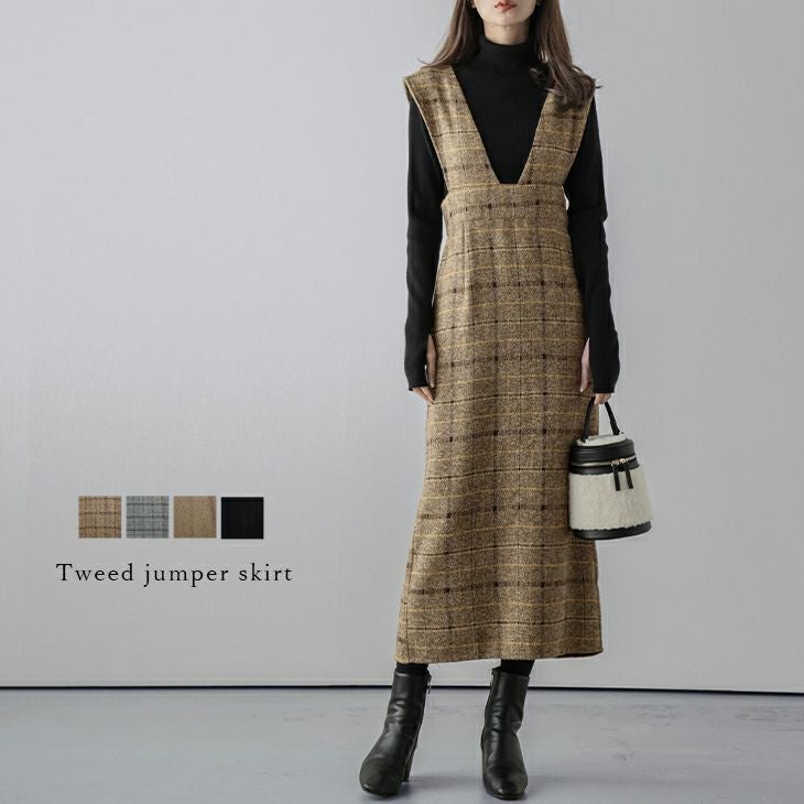 スカート ジャンパースカート ジャンパー ワンピース ツイード スカート ジャンパースカート ジャンパー グレンチェック ワンピース ツイード ロング丈 バックスリット ボトムス レディース 脚長効果 動きやすい キレイめ おすすめ おしゃれ ブラック 2025秋新作【lswp210-581】【即納:1-5営業日】【送料無料】メ込2