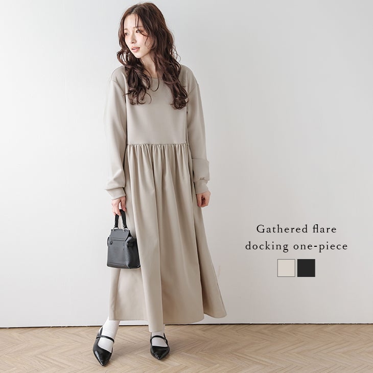ドッキングワンピース ギャザーフレア ポンチ素材 クルーネック ドッキングワンピース ギャザーフレア ポンチ素材 クルーネック ロングワンピース 長袖 体型カバー マタニティウェア シンプル レディース おすすめ おしゃれ 2026春夏新作 【lswpss26-1937】【予約販売:4月2日入荷予定順次発送】【送料無料】宅込