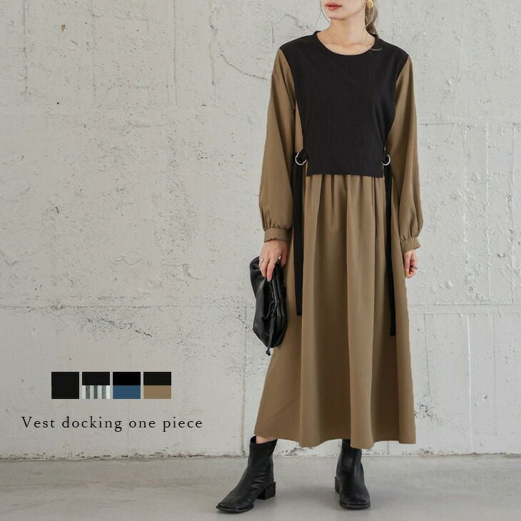 ドッキングワンピース ロング 異素材ワンピ キレイめ ドッキングワンピース ロング 異素材ワンピ 重ね着風 キレイめ 大人可愛い オフィス 長袖 レディース おすすめ おしゃれ フリーサイズ メール便 2025春夏新作【lswp307-577】【即納:1-5営業日】【送料無料】メ込2