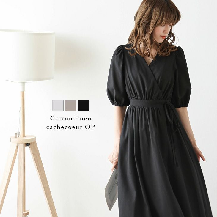 ワンピース カシュクール 5分袖 コットン リネン ワンピース カシュクール 5分袖 コットン リネン フレアシルエット ぽわん袖 キレイめ 上品 レディース おすすめ おしゃれ フリーサイズ メール便 2025春夏新作【lswpss24-298】【即納:1-5営業日】【送料無料】メ込2