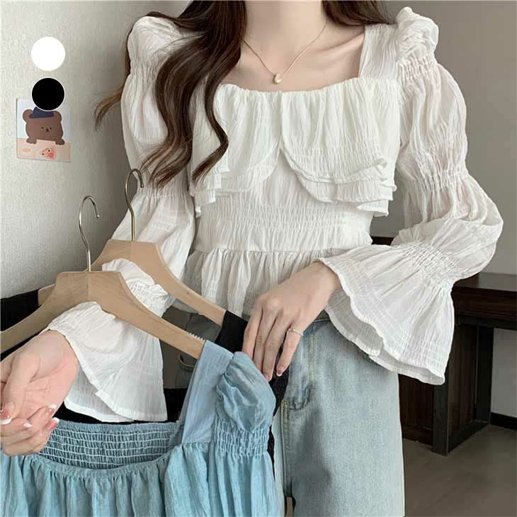 トップス ショート丈 パフスリーブ シフォン スクエアネック [AMELY by La-gemme]トップス ショート丈 パフスリーブ シフォン スクエアネック フリルブラウス ボリューム袖 フェミニン 長袖 おすすめ レディース オシャレ トレンド 人気 プチプラ 韓国ファッション 【69783-x】【予約販売:15-20日】【送料無料】メ込2
