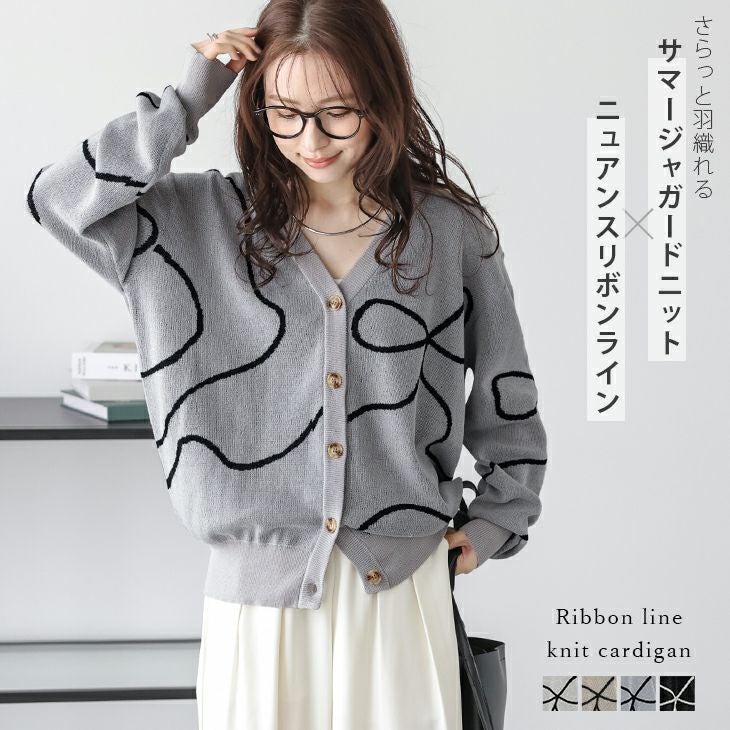 ラインデザイン リボン カーディガン サマーニット [AMELY by La-gemme]ラインデザイン リボン カーディガン サマーニット ジャガード Vネック オーバーサイズ 大人かわいい レディース おすすめ おしゃれ フリーサイズ メール便 2025春夏新作【aotss25-1164】【即納:1-5営業日】【送料無料】メ込2