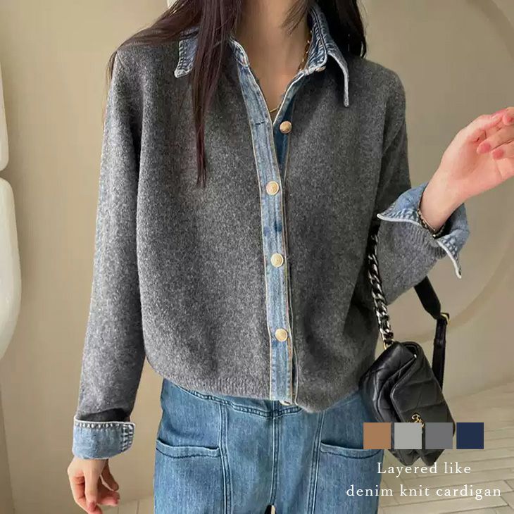 レイヤード風 デニム ニット カーディガン ドッキング [AMELY by La-gemme]レイヤード風 デニム ニット カーディガン ドッキング 襟付き カジュアル 重ね着風 キレイめ 大人カジュアル 長袖 レディース おすすめ おしゃれ フリーサイズ 2025秋冬新作【atpaw25-1764】【予約販売:11月13日入荷予定順次発送】【送料無料】メ込2