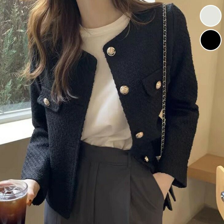 ツイード風 ショート丈ジャケット ノーカラー レトロ ゴールド [AMELY by La-gemme]ツイード風 ショート丈ジャケット ノーカラー レトロ ゴールドボタン フェミニン デート 大人かわいい おすすめ おしゃれ レディース トレンド 人気 プチプラ 韓国ファッション 2025新作 【1518-fx1】【即納:1-5営業日】【送料無料】宅込