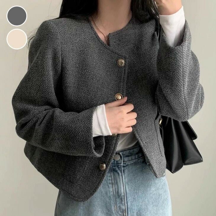 ツイード風 ショートジャケット 金ボタン ノーカラー [AMELY by La-gemme]ツイード風 ショートジャケット 金ボタン ノーカラー クロップド丈 キレイめ 大人カジュアル デート 通勤 おすすめ おしゃれ レディース トレンド 人気 プチプラ 韓国ファッション 2025新作 【2116-fx1】【予約販売:15-20日】【送料無料】宅込