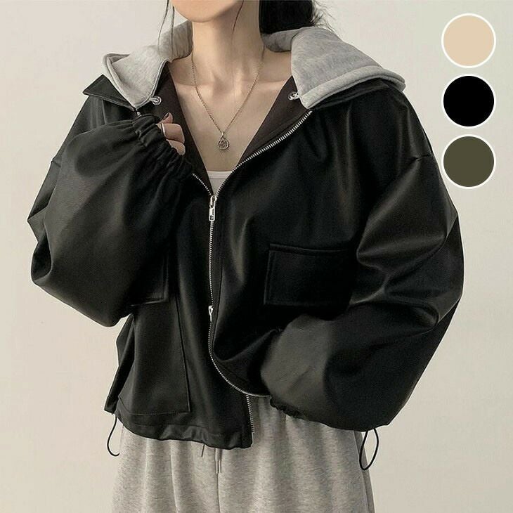 レイヤード風 パーカー ドッキングジャケット レザー調 [AMELY by La-gemme]レイヤード風 パーカー ドッキングジャケット レザー調 フード付き クロップド丈 ドロップショルダー オーバーサイズ カジュアル おしゃれ レディース トレンド プチプラ 韓国ファッション 2025新作 【2794-bm】【予約販売:15-20日】【送料無料】宅込