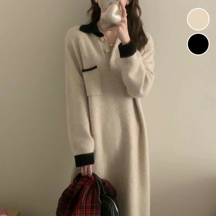 ワンピース ニットワンピ ロング丈 ロングワンピース 長袖 [AMELY by La-gemme]ワンピース ニットワンピ ロング丈 ロングワンピース 長袖 ヘンリーネック 胸ポケット 秋冬 カジュアル おすすめ レディース オシャレ トレンド 人気 プチプラ 韓国ファッション 【6335-fx1】【予約販売:15-20日】【送料無料】宅込