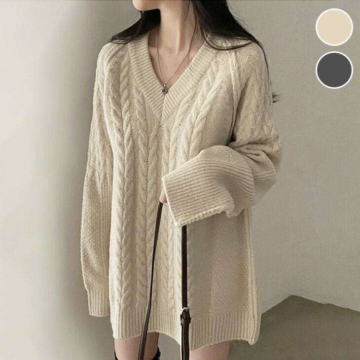 ケーブル編みニット セーター トップス 長袖 カジュアル [AMELY by La-gemme]ケーブル編みニット セーター トップス 長袖 カジュアル オーバーサイズ ミドル丈 Vネック 無地 シンプル おすすめ レディース オシャレ トレンド 人気 プチプラ 韓国ファッション 【9994-tb】【予約販売:15-20日】宅入