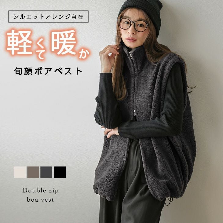 ボア ベスト ダブルジップ ドロスト スタンドネック ボア ベスト ダブルジップ ドロスト スタンドネック アウター 防寒 重ね着 レイヤード 大人カジュアル 暖かい レディース おすすめ おしゃれ フリーサイズ 2025秋冬新作【lsotaw25-1723】【即納:1-5営業日】【送料無料】宅込