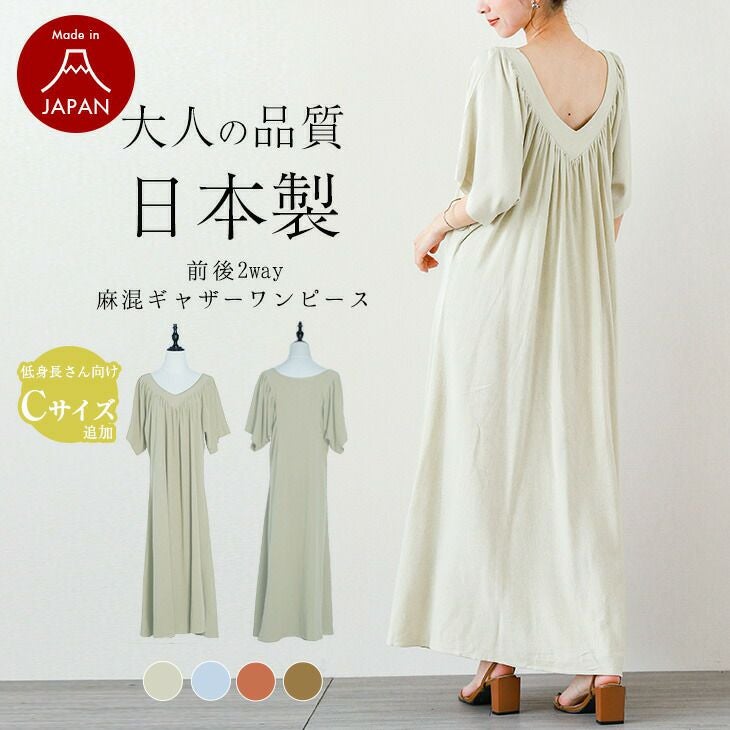日本製 リネン混 ギャザー ワンピース 前後2way 日本製 リネン混 ギャザー ワンピース 前後2way レディース 五分袖 半袖 Vネック 麻混 コットン マキシ丈 ロング丈 大人ナチュラル Aライン 低身長さん向け ゆったり 2025春夏新作 C/フリー 【lgww-at2893】【即納:1-5営業日】【送料無料】宅込