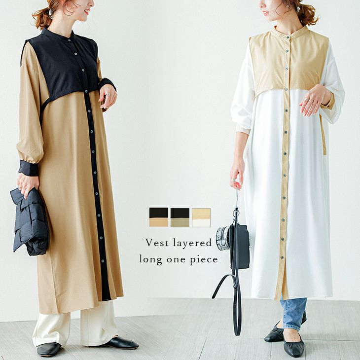 レイヤード ロング ワンピース 長袖 ベスト レイヤード ロング ワンピース 長袖 ベスト ハイネック レディース おすすめ おしゃれ 大人カジュアル フリーサイズ メール便 2025春夏新作 【lgww-at3135】【即納:1-5営業日】【送料無料】メ込1