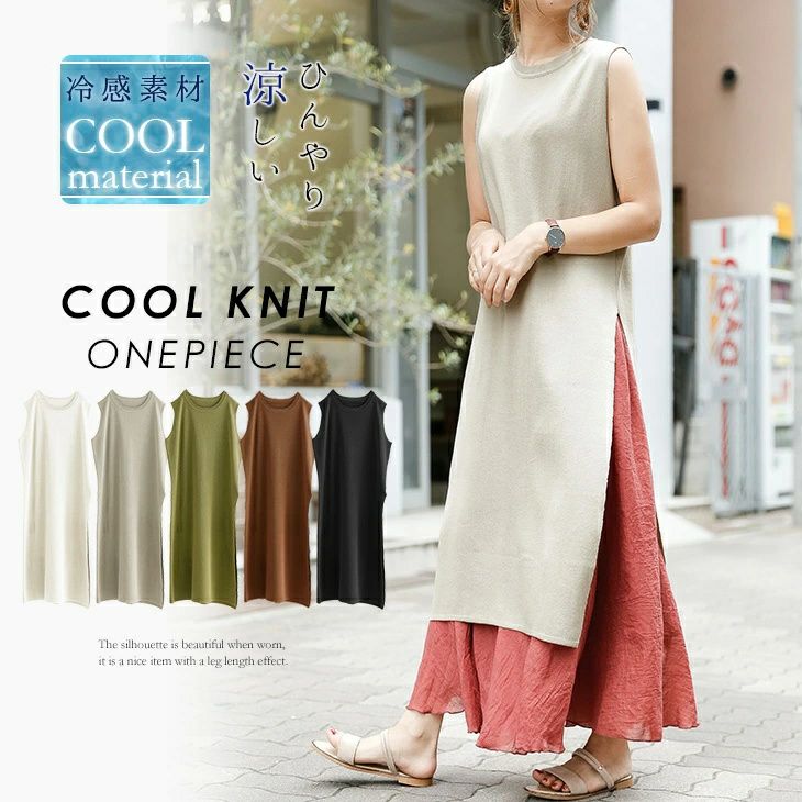 ワンピース ロング丈 スリット入り サマーニット ニットワンピ ワンピース ロング丈 スリット入り サマーニット 涼しい 冷感素材 ニットワンピ ニット ノースリーブ 袖なし 夏 無地 シンプル 大人 レディース ブラック ホワイト メール便 2025春夏新作 フリー 【lgww-at3401】【即納:1-5営業日】【送料無料】メ込2