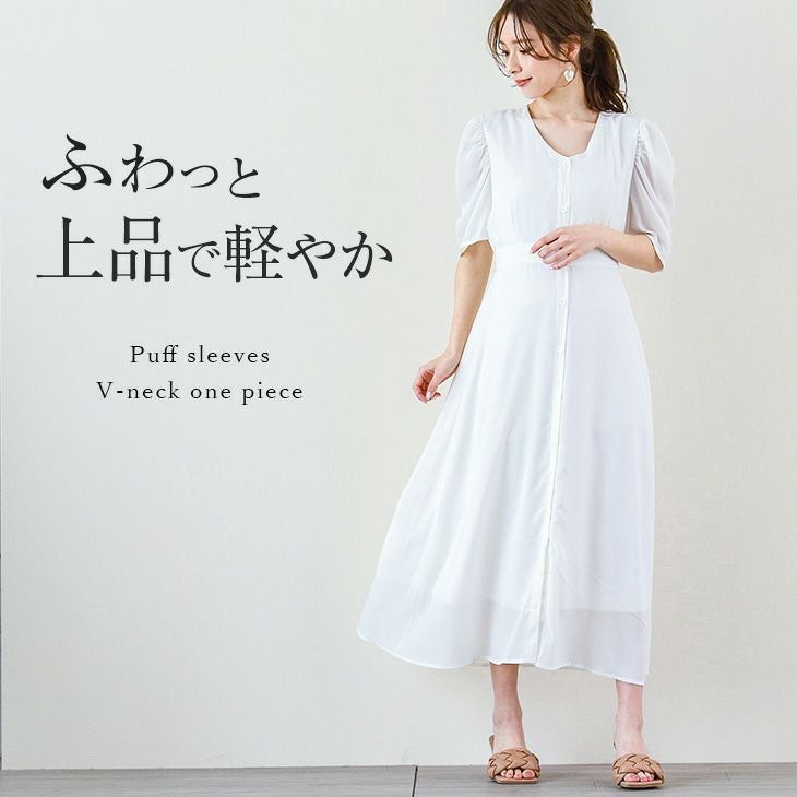 Vネック ワンピース レディース 半袖 マキシ丈 Vネック ワンピース レディース 半袖 マキシ丈 ロング丈 フロントボタン パフスリーブ ウエストギャザー 花柄 フラワー 上品 大人 きれいめ 可愛い 無地 メール便 2025秋新作 M/L 【lgww-at4534】【即納:1-5営業日】【送料無料】メ込2