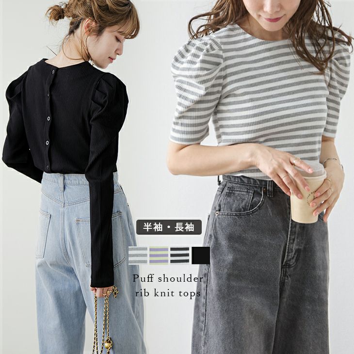 ボーダーリブニット カットソー 半袖 長袖 パフショルダー 柔らかい 【春夏半額SALE対象】 ボーダーリブニット カットソー 長袖 パフショルダー 柔らかい トップス 大人かわいい レディース ブラック フリーサイズ メール便 2025春夏新作 【lstp212-344】【即納:1-5営業日】【送料無料】ユ込3