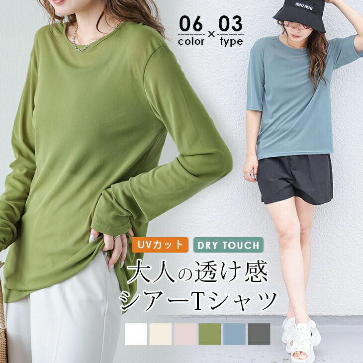 シアーTシャツ 3タイプ ラウンドネック Vネック 長袖