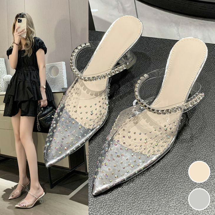 ポインテッドトゥ スタッズ パンプス ミュール PU [AMELY by La-gemme]ポインテッドトゥ スタッズ パンプス ミュール PU ヒール スケルトン ストラップ ベルト きれいめ クリア 女子会 ガーリー シンプル お洒落 レディース 大人 韓国ファッション【k3-fh1666】【予約販売:15-20日】【送料無料】60込