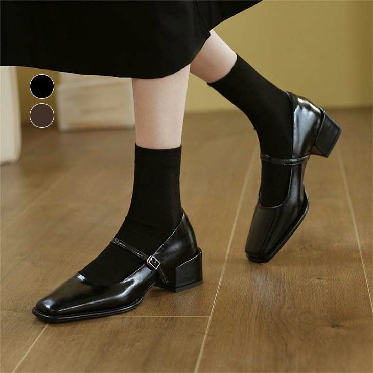 スクエアトゥ パンプス ストラップ ベルト チャンキーヒール [AMELY by La-gemme]スクエアトゥ パンプス ストラップ ベルト チャンキーヒール 太ヒール PU エナメル ローヒール きれいめ かわいい ガーリー シンプル お洒落 レディース 大人 韓国ファッション【k3-jy122】【予約販売:15-20日】【送料無料】宅込