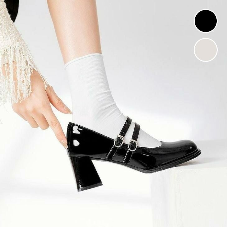 スクエアトゥ 2重ベルト ストラップ チャンキーヒール 太ヒール [AMELY by La-gemme]スクエアトゥ 2重ベルト ストラップ チャンキーヒール 太ヒール PU エナメル かわいい 発表会 お出かけ 女子会 ガーリー シンプル お洒落 レディース 大人 韓国ファッション 【k3-jya2035】【予約販売:15-20日】【送料無料】60込