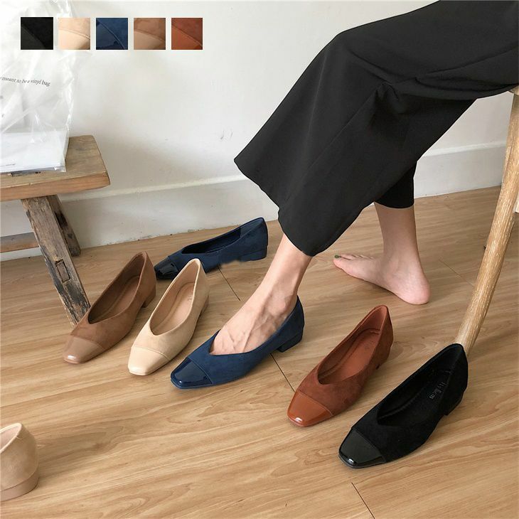スクエアトゥ パンプス 切替 スエード調 エナメル スクエアトゥ パンプス 切替 スエード調 エナメル ローヒール フラットシューズ かわいい きれいめ OL 通勤 楽ちん 韓国ファッション【tty612-8】【予約販売:15-20日】【送料無料】宅込