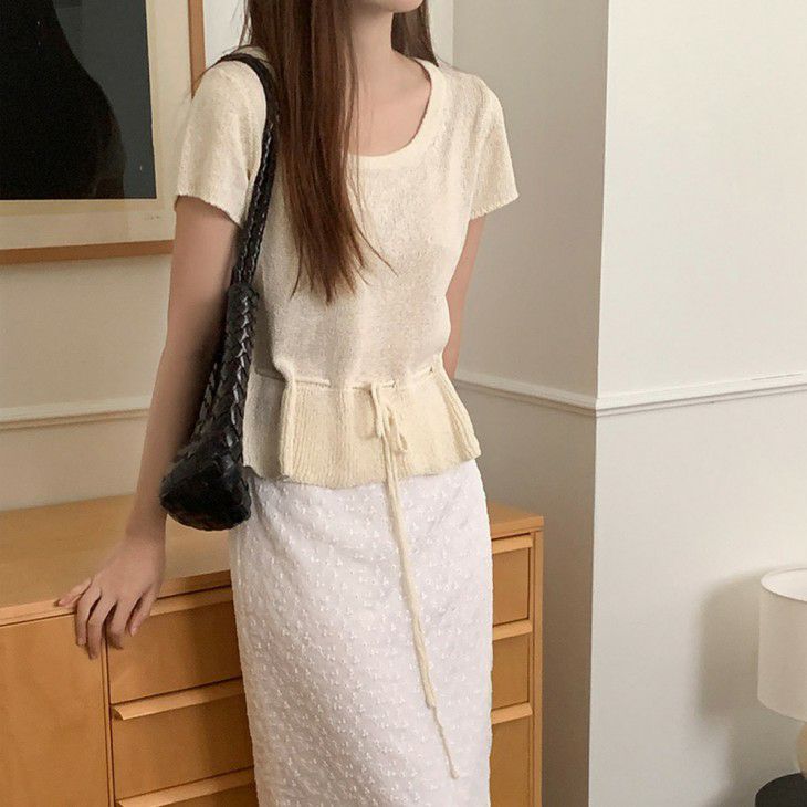 サマーニット トップス 半袖 透け感 上品 [AMELY by La-gemme]サマーニット トップス 半袖 透け感 上品 大人可愛い ウエストリボン デート おすすめ おしゃれ レディース トレンド 人気 プチプラ 韓国ファッション 2025春夏新作 【23246-d】【予約販売:15-20日】【送料無料】メ込2
