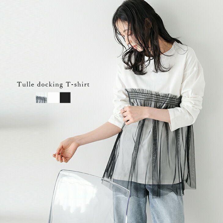 Tシャツ ドッキング チュール素材 半袖 長袖 ラウンドネック 【春夏半額SALE対象】 [AMELY by La-gemme]Tシャツ ドッキング チュール素材 長袖 半袖 ラウンドネック アシンメトリー トップス レディース おすすめ おしゃれ フリーサイズ メール便 2025春夏新作 【atpss24-255】【即納:1-5営業日】【送料無料】ユ込2