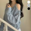 トップス オープンショルダー スリット リボン ニット [AMELY by La-gemme]トップス オープンショルダー スリット リボン ニット クロップド丈 透かし編み シアー カジュアル 長袖 レディース 韓国ファッション 【24aw-it36】【予約販売:15-20日】【送料無料】メ込2
