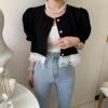 ショート丈ニットカーデ フリル ドッキング フェミニン 女子会 [AMELY by La-gemme]ショート丈ニットカーデ フリル ドッキング フェミニン 女子会 オケージョン おすすめ レディース オシャレ トレンド 人気 プチプラ 韓国ファッション 【7032-fx】【予約販売:15-20日】【送料無料】メ込2