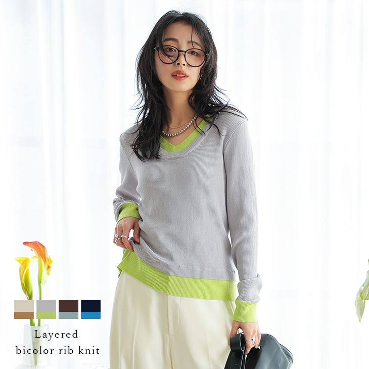 レイヤード風 バイカラー リブニット 重ね着風 【春夏半額SALE対象】 レイヤード風 バイカラー リブニット トップス 重ね着風 Vネック インナー 抜け感 配色 キレイめ レディース おすすめ おしゃれ フリーサイズ メール便 2026春夏新作【lstpss26-1959】【予約販売:3月26日入荷予定順次発送】【送料無料】メ込2
