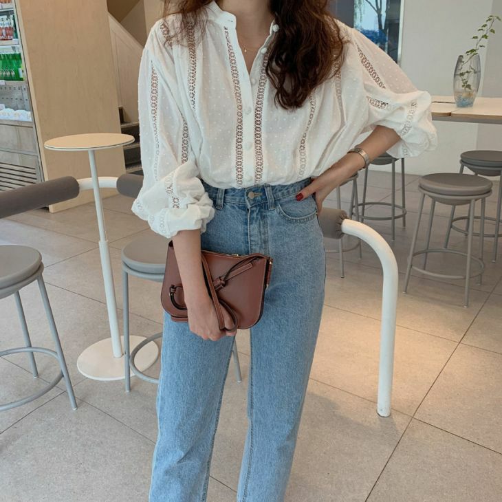 ノーカラー デザイン シャツ ブラウス レース [AMELY by La-gemme]ノーカラー デザイン シャツ ブラウス レース 丸ボタン シアー 透け感 シンプル ボヘミアン カジュアル 春夏 おすすめ レディース オシャレ トレンド 人気 プチプラ 韓国ファッション【24aw-it183】【予約販売:15-20日】【送料無料】メ込2