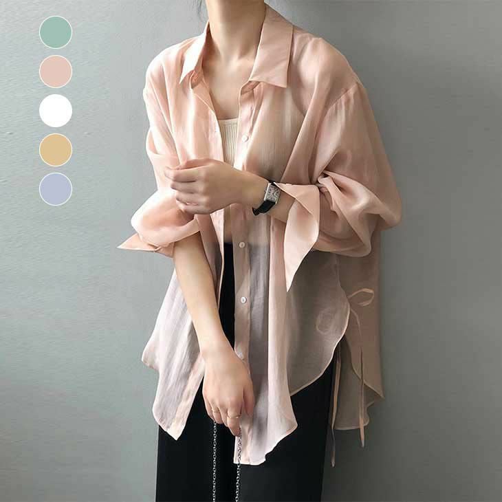 サイド リボン シアー シャツ 透け感 [AMELY by La-gemme]サイド リボン シアー シャツ 透け感 ゆったり 羽織り カジュアル きれいめ オフィス パステルカラー おすすめ レディース オシャレ トレンド 人気 プチプラ 韓国ファッション【3117-jfl】【予約販売:15-20日】【送料無料】メ込2