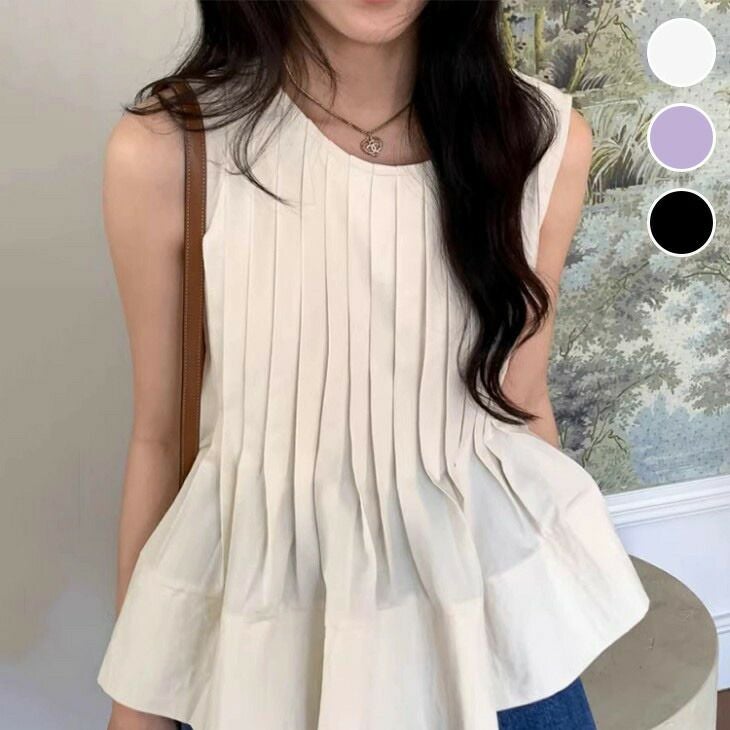 プリーツフレアトップス プリーツ ペプラム リネン風 涼しい [AMELY by La-gemme]プリーツフレアトップス プリーツ ペプラム リネン風 涼しい ノースリブ おすすめ レディース オシャレ トレンド 人気 プチプラ 韓国ファッション 【6771-dxh】【予約販売:15-20日】【送料無料】メ込2