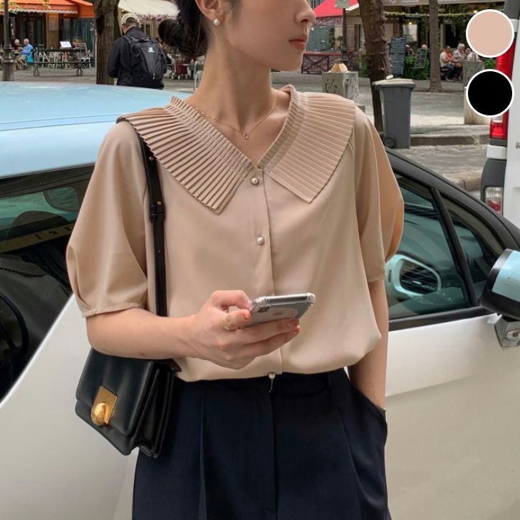 プリーツカラー ブラウス シフォン シャツ 半袖 [AMELY by La-gemme]プリーツカラー ブラウス シフォン シャツ 半袖 夏 トップス プリーツ 半袖シャツ シフォンシャツ カジュアル オフィス きれいめ オシャレ 可愛い 韓国ファッション 【atp406-185】【予約販売:15-20日】【送料無料】ユ込2